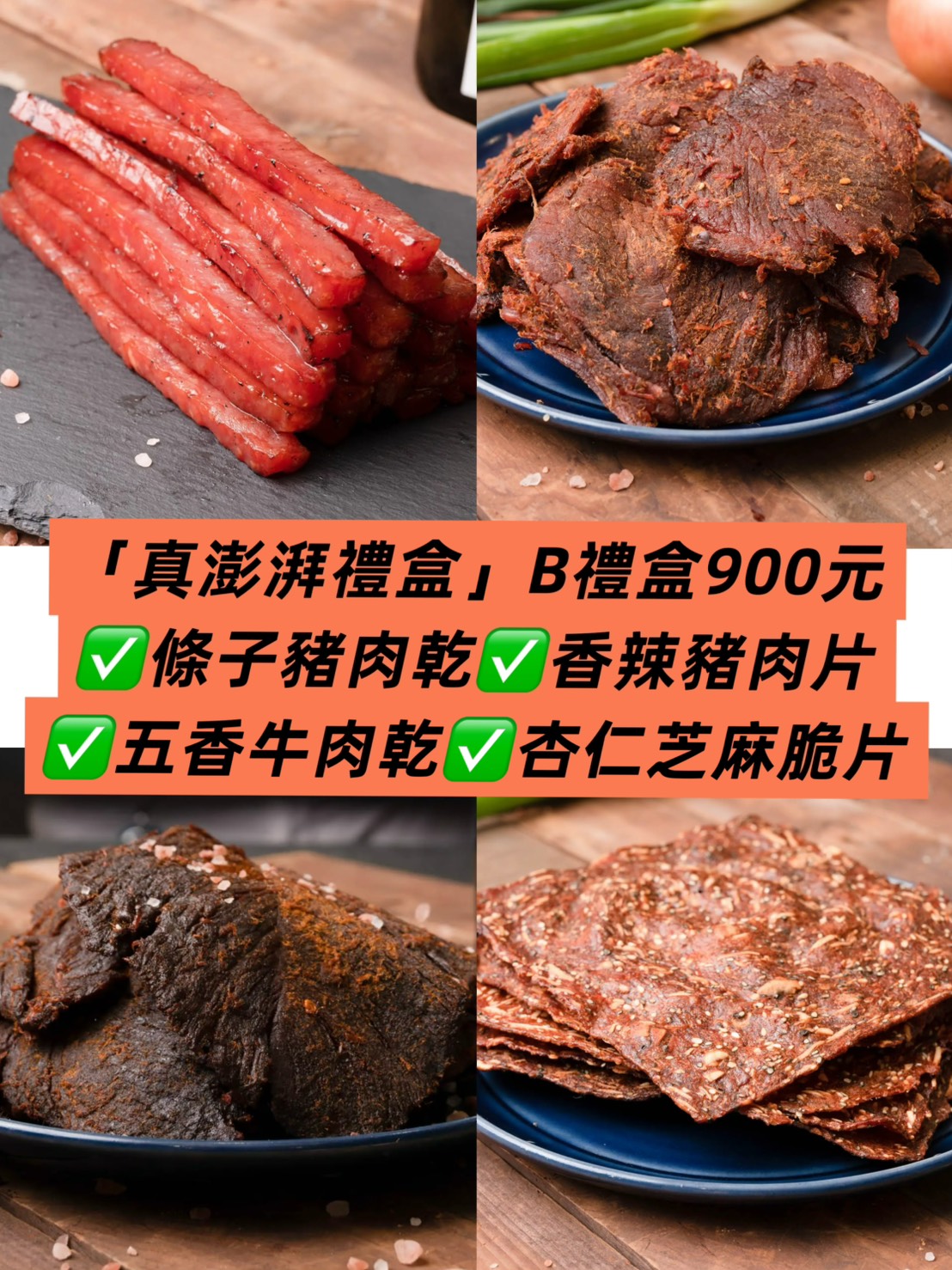 規格:條子肉乾+香辣豬肉片+五香牛肉乾+杏仁芝麻脆片